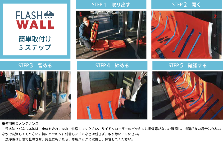北欧ノルウェイに本社を置くAquaFence(アクアフェンス)社が特許を取得した最先端技術を活用した「FlashWall(フラッシュウォール)」は、水位50cmまでの水がオフィスや店舗などの入口から屋内へ浸水するのを防止する装置であり、冠水による損害や事業の停滞を懸念されている場所への設置に適しています。
