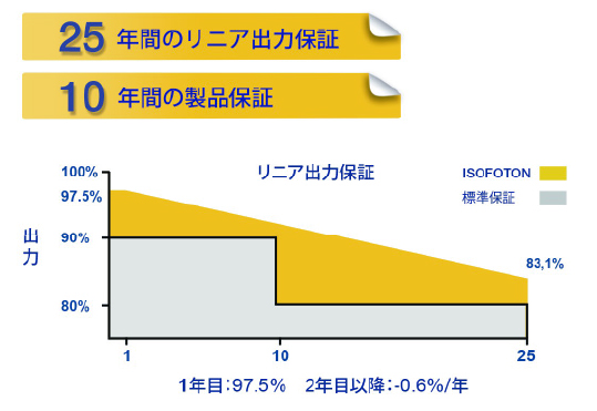 イソフォトン太陽電池パネルは、40年の実績があるからこそできる長期出力保証です。